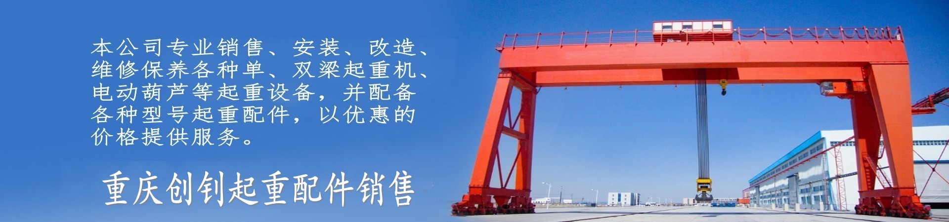 销售热线:15823100300重庆创钊起重设备有限公司重庆起重机厂家|重庆龙门吊|重庆行车维修保养重庆创钊起重销售部主要生产销售:桥式起重机、门式起重机、工程起重机、小型起重机械、电动葫芦、电动葫芦配件、门式起重配件、电动单梁起重机配件、双梁桥式起重机配件、升降搬运设备、起重配套工具 桥式起重机、门式起重机、工程起重机、小型起重机械、电动葫芦、电动葫芦配件、门式起重配件、电动单梁起重机配件、双梁桥式起重机配件、升降搬运设备、起重配套工具等起重设备。本公司专业销售、安装、改造、维修保养各种单、双梁起重机、...【更多】