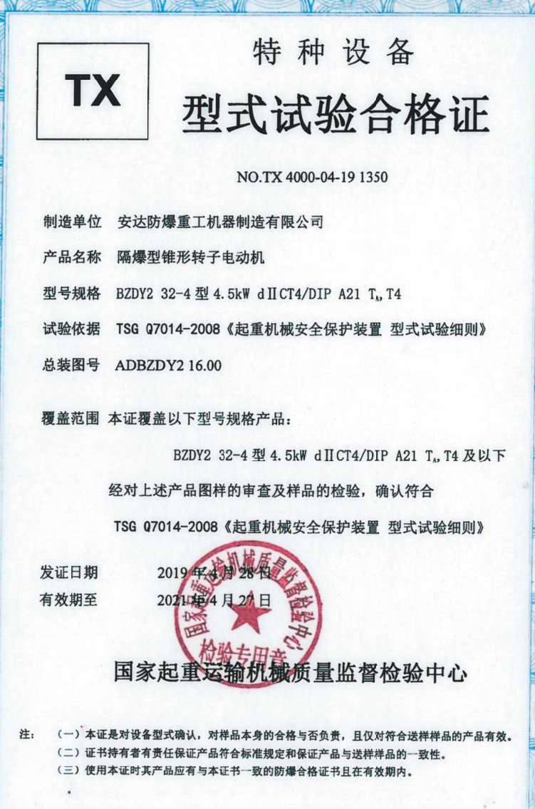 » 隔爆型锥形转子电动机 TX型式试验合格证