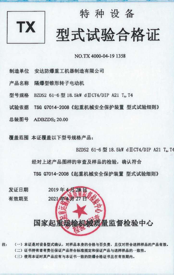隔爆型锥形转子电动机 TX型式试验合格证