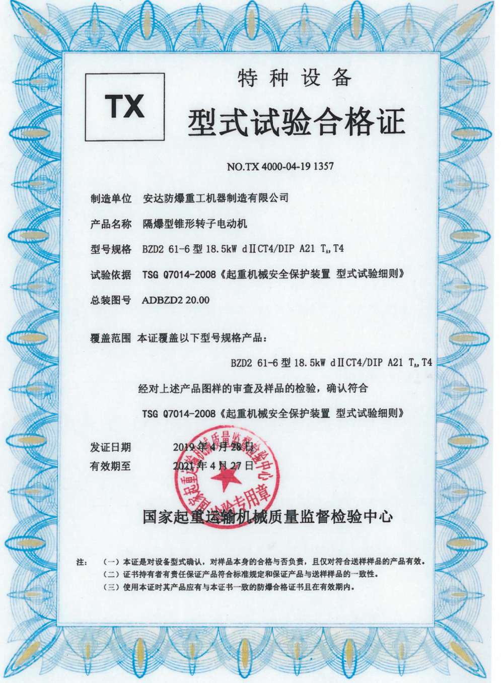 隔爆型锥形转子电动机 TX型式试验合格证