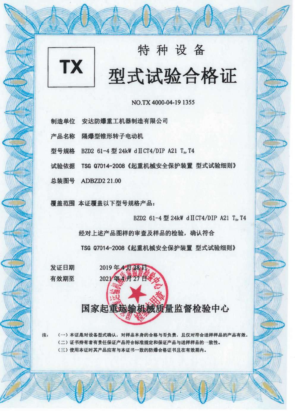 隔爆型锥形转子电动机 TX型式试验合格证