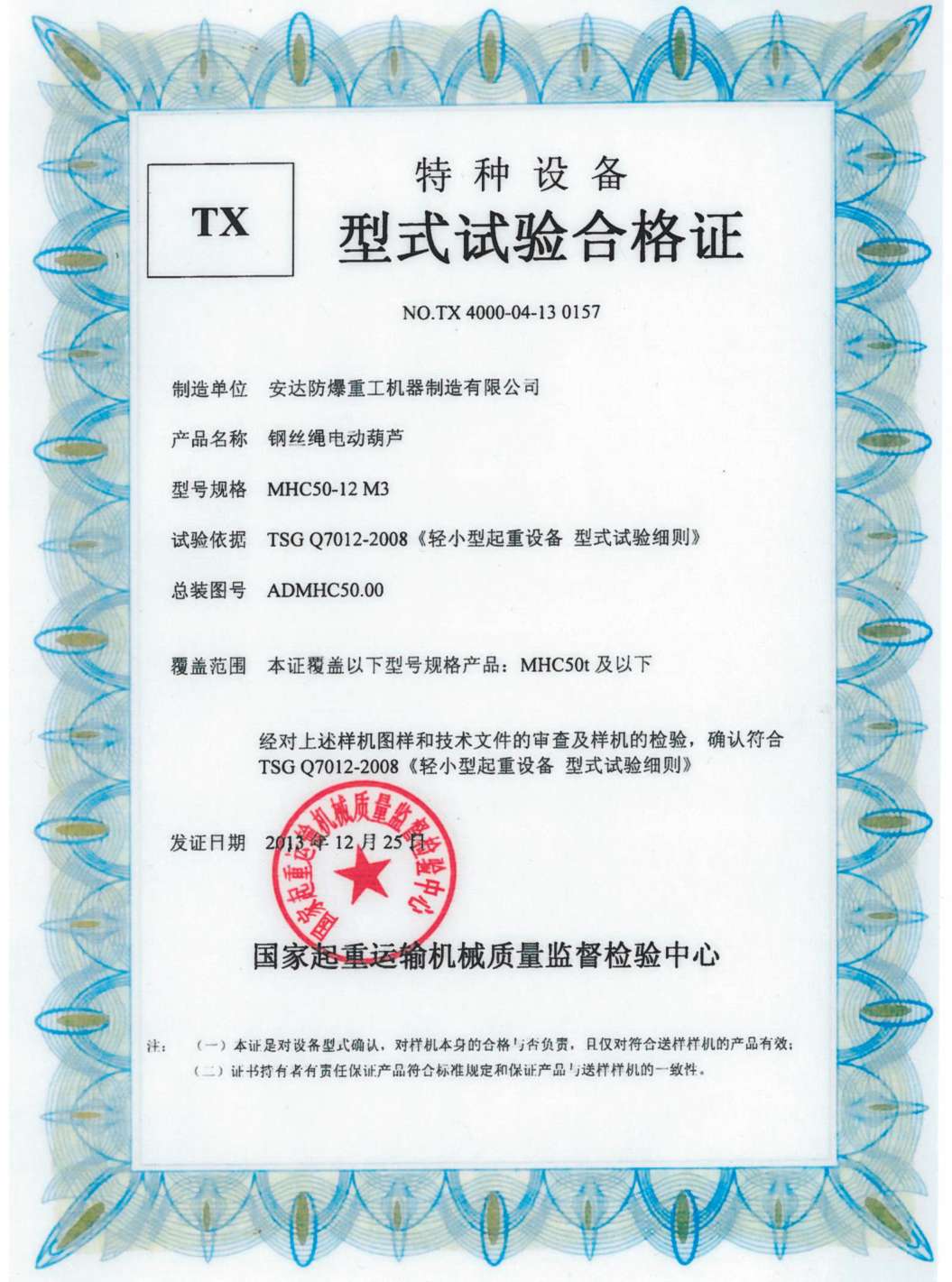 钢丝绳电动葫芦 TX型式试验合格证