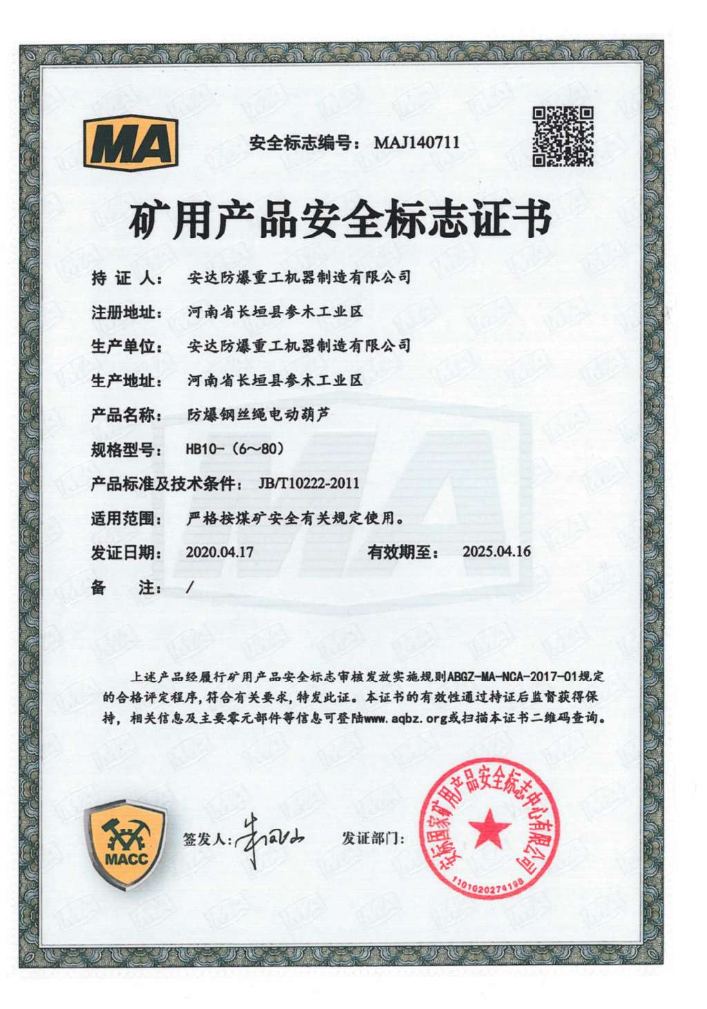 防爆钢丝绳电动葫芦 矿用产品安全标志证书
