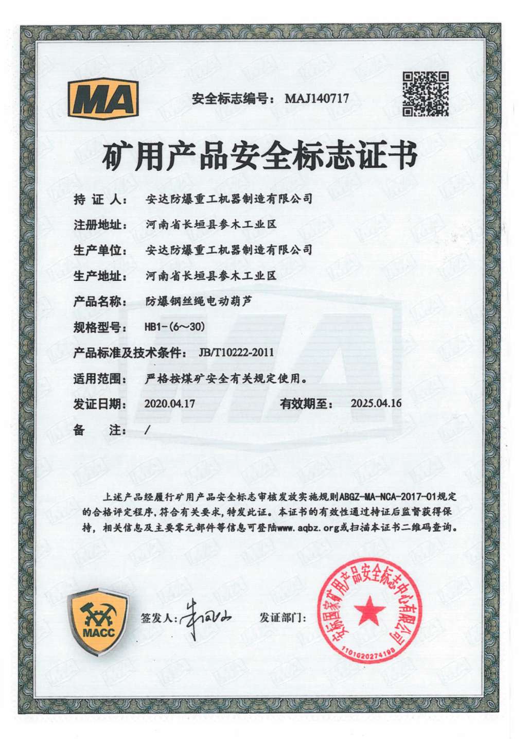 防爆钢丝绳电动葫芦 矿用产品安全标志证书
