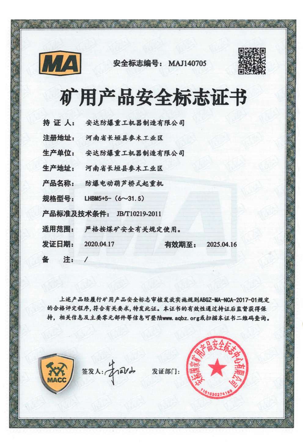 防爆钢丝绳葫芦桥式起重机 矿用产品安全标志证书