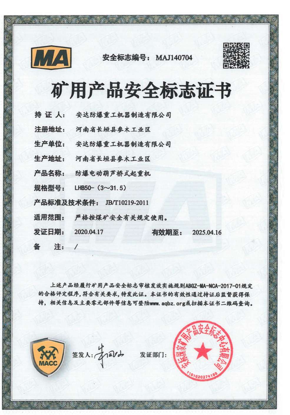 防爆钢丝绳葫芦桥式起重机 矿用产品安全标志证书