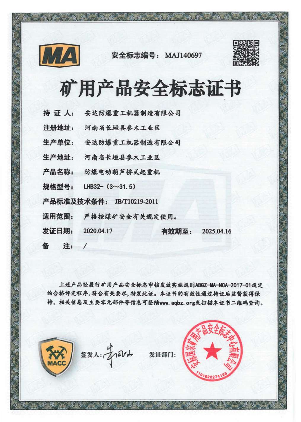 防爆钢丝绳葫芦桥式起重机 矿用产品安全标志证书
