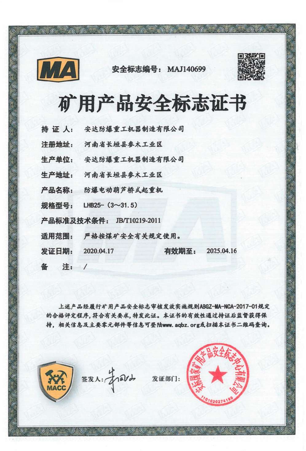 防爆钢丝绳葫芦桥式起重机 矿用产品安全标志证书