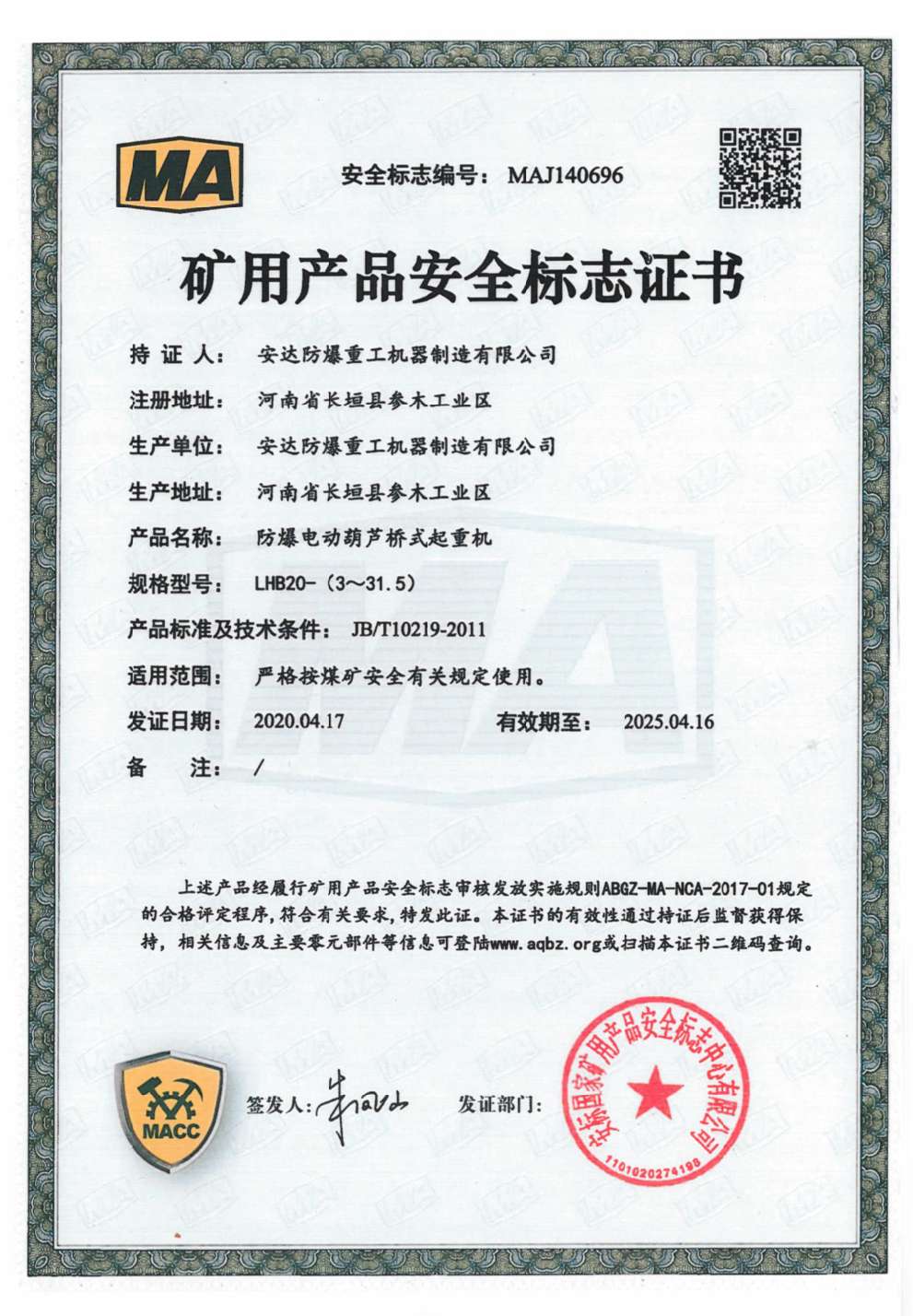 防爆钢丝绳葫芦桥式起重机 矿用产品安全标志证书