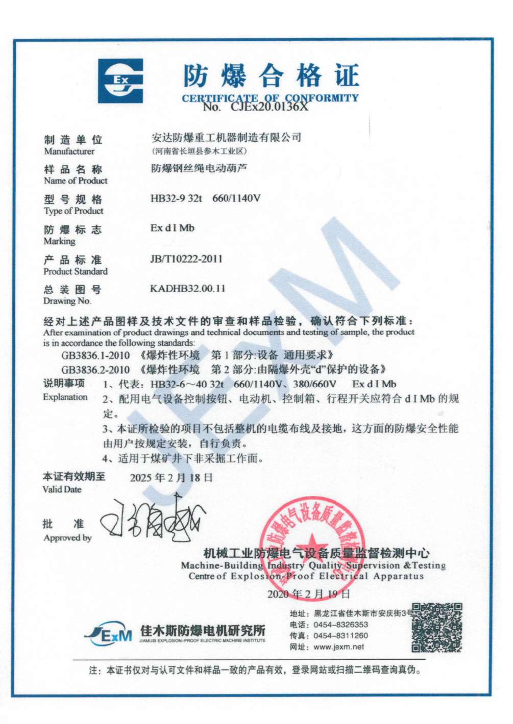 » 防爆钢丝绳电动葫芦 防爆合格证