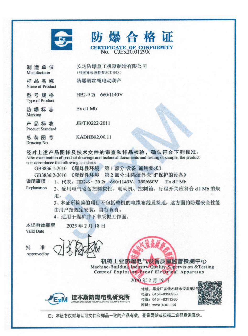 » 防爆钢丝绳电动葫芦 防爆合格证