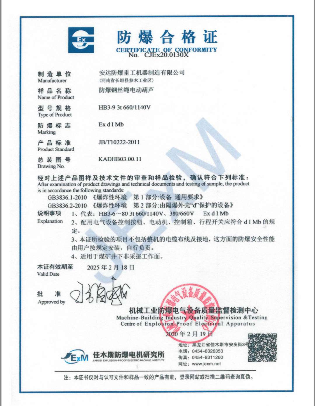 » 防爆钢丝绳电动葫芦 防爆合格证