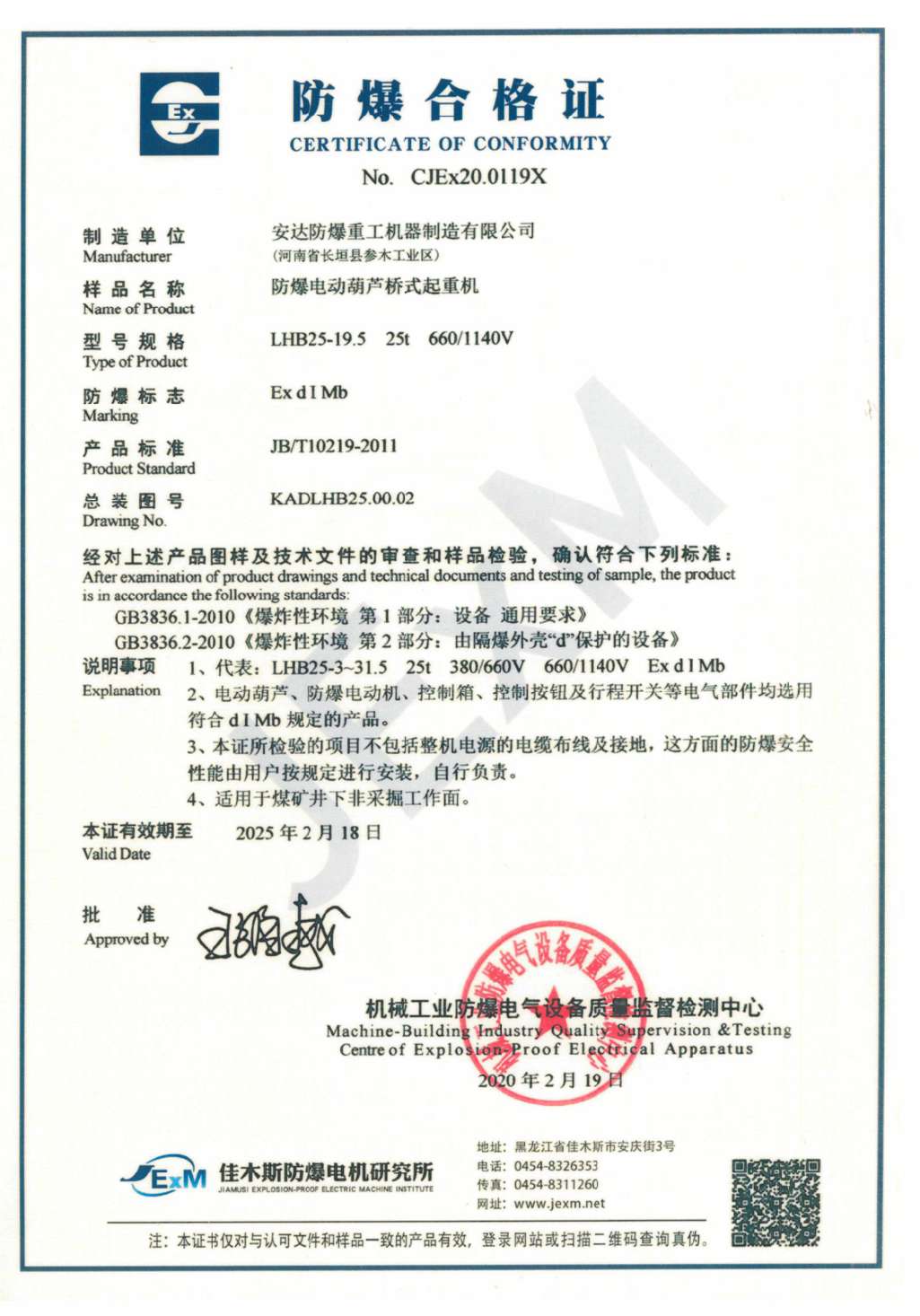 » 防爆电动葫芦桥式起重机 防爆合格证