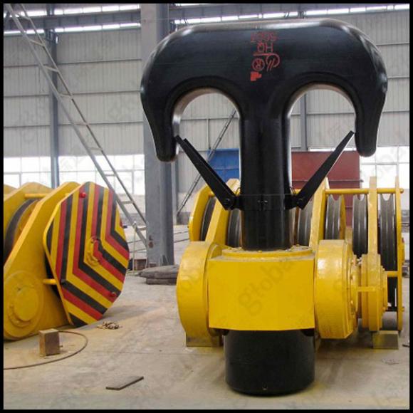 吊钩组是起重机械中**常见的一种吊具。吊钩常借助于滑轮组等部件悬挂在起升机构的钢丝绳上。吊钩是取物装置中使用**广泛的一种,具有制造简单和使用性强的特点。 产品分类:吊钩按形状分为单钩和双钩;按制造方法分为锻造吊钩和叠片式吊钩。单钩制造简单、使用方便,但受力情况不好,大多用在起重量为80吨以下的工作场合;起重量大时常采用受力对称的双钩。叠片式吊钩由数片切割成形的钢板铆接而成,个别板材出现裂纹时整个吊钩不会破坏,安全性较好,但自重较大,大多用在大起重量或吊运钢水盛桶的起重机上。