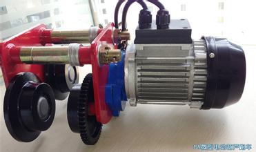 运行机构也称电动小车、运行小车,跑车,由带制动器的锥形转子电动机通过运行减速器带动小车的一对主动轮,使整个葫芦沿着工字钢轨道移动;5t(含5t)以下为一套驱动装置,10t、16t采用两套驱动装置;当用于箱形梁或与H型钢配套使用时,车轮踏面为直线形,用于工字钢轨道时,车轮踏面为圆弧形。