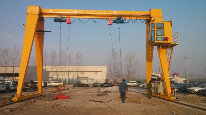 门式起重机(又称龙门起重机)是桥架通过两侧支腿支撑在地面轨道上的