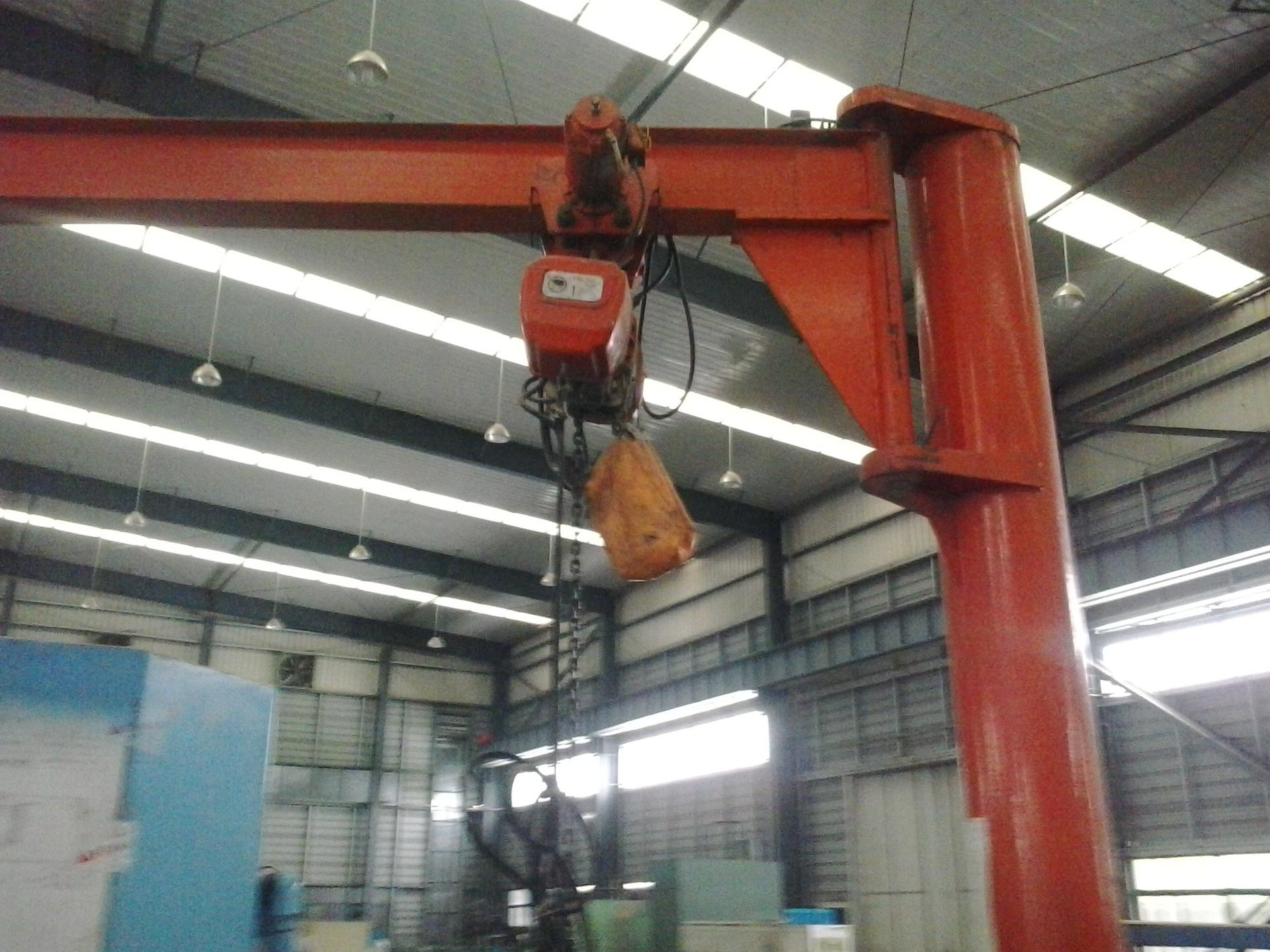 旋臂起重机工作强度为轻型,起重机由立柱,回转臂回转驱动装置及电动葫芦组成,立柱下端通过地脚螺栓固定在混凝土基础上,由摆线针轮减速装置来驱动旋臂回转,电动葫芦在旋臂工字钢上作左右直线运行,并起吊重物。起重机旋臂为空心型钢结构,自重轻,跨度大,起重量大,经济耐用。内置式行旋臂吊MODE型走机构,采用带滚动轴承的特种工程塑料走轮,摩擦力小,行走轻快;结构尺寸小,特别有利于提高吊钩行程。