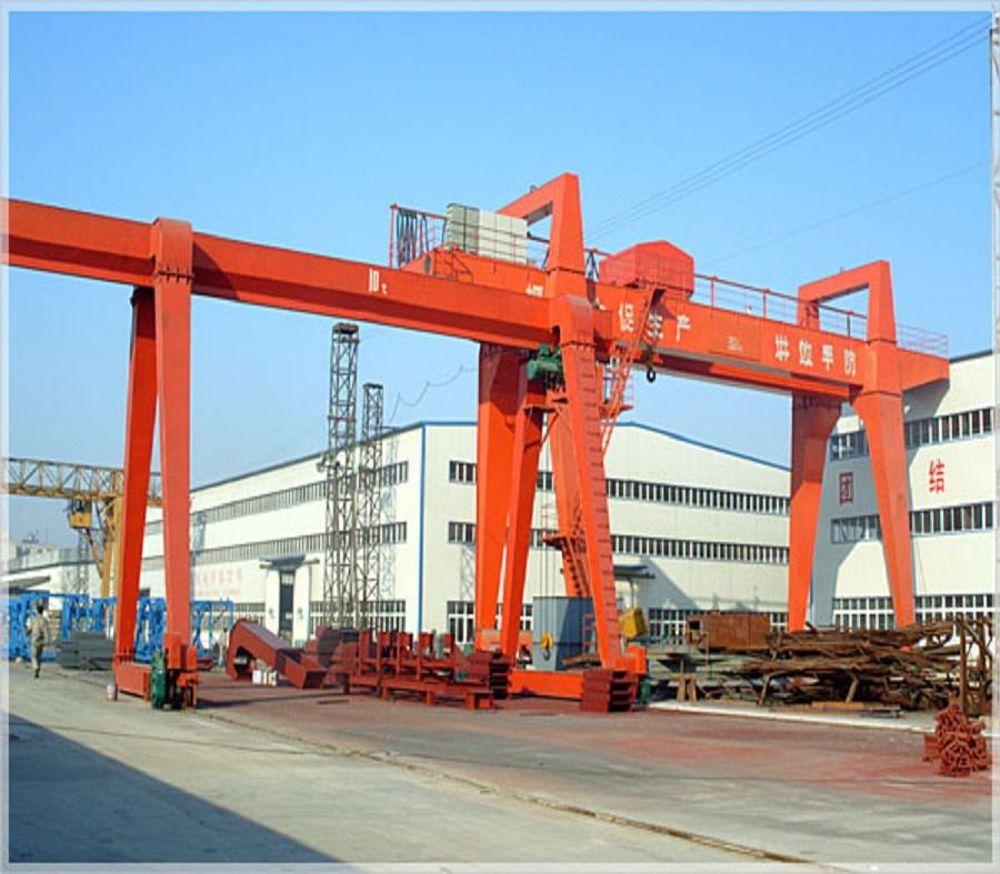 单主梁门式起重机结构简单,制造安装方便,自身质量小,主梁多为偏轨箱形架结构。与双主梁门式起重机相比,整体刚度要弱一些。因此,当起重量Q≤50t、跨度S≤35m时,可采用这种形式。单主梁门式起重机门腿有L型和C型两种形式。L型的制造安装方便,受力情况好,自身质量较小,但是,吊运货物通过支腿处的空间相对小一些。C型的支脚做成倾斜或弯曲形,目的在于有较大的横向空间,以使货物顺利通过支脚。