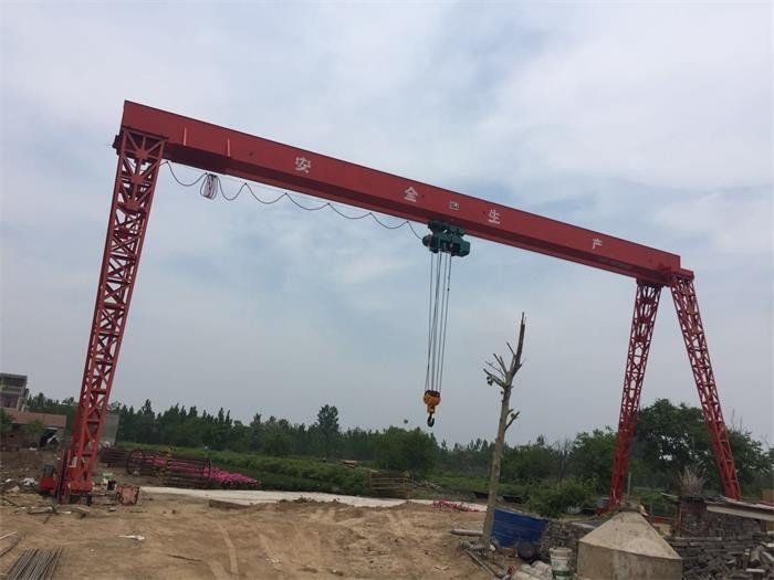 单主梁门式起重机结构简单,制造安装方便,自身质量小,主梁多为偏轨箱形架结构。与双主梁门式起重机相比,整体刚度要弱一些。因此,当起重量Q≤50t、跨度S≤35m时,可采用这种形式。单主梁门式起重机门腿有L型和C型两种形式。L型的制造安装方便,受力情况好,自身质量较小,但是,吊运货物通过支腿处的空间相对小一些。C型的支脚做成倾斜或弯曲形,目的在于有较大的横向空间,以使货物顺利通过支脚