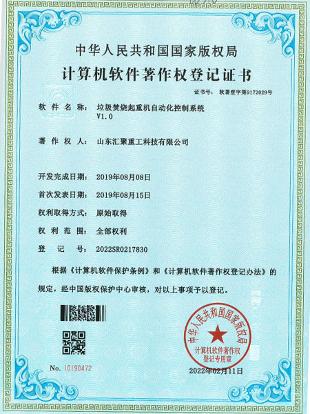 垃圾焚烧起重机自动化控制系统 V1.0(自动化证书)