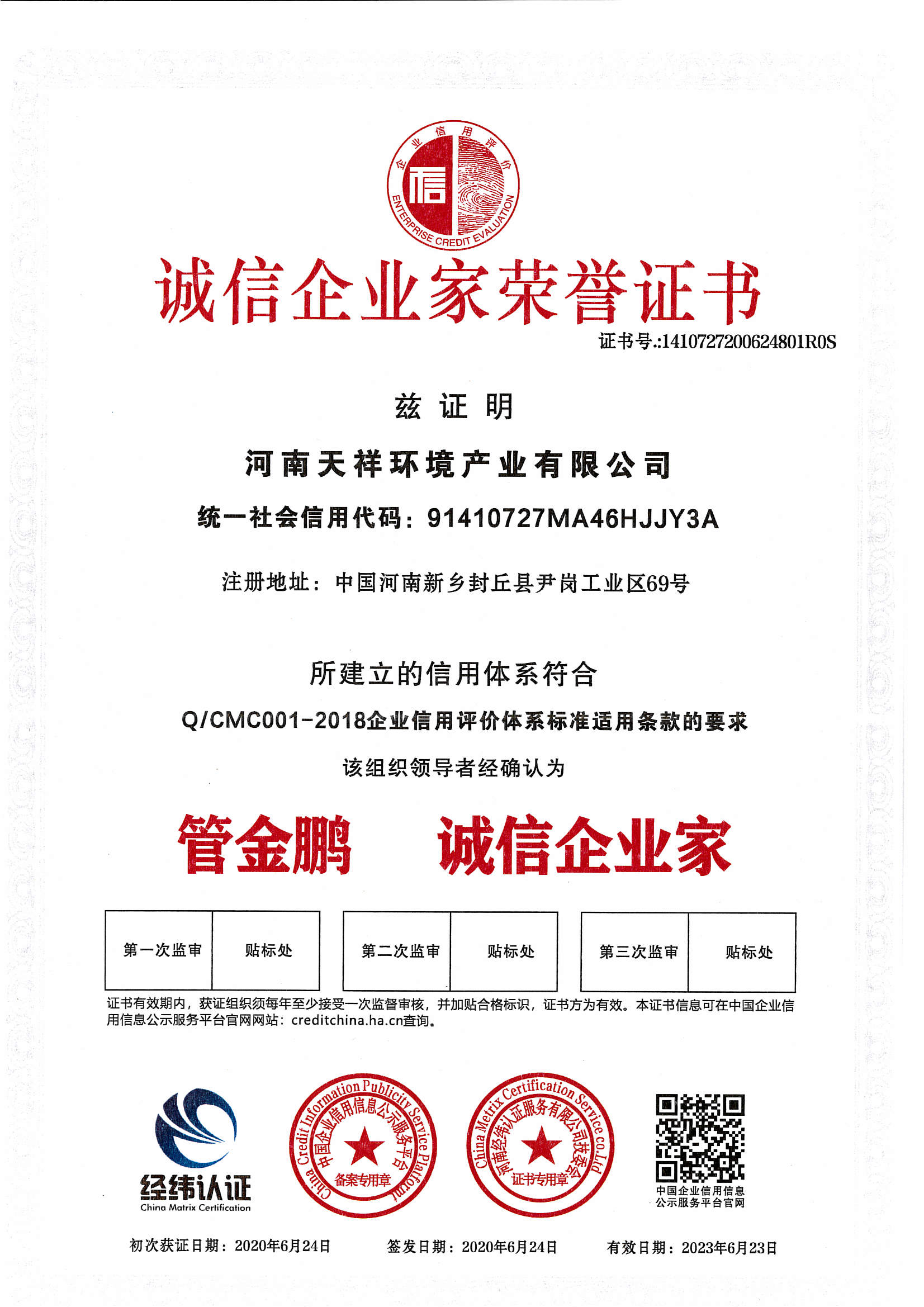 » 诚信企业家荣誉证书