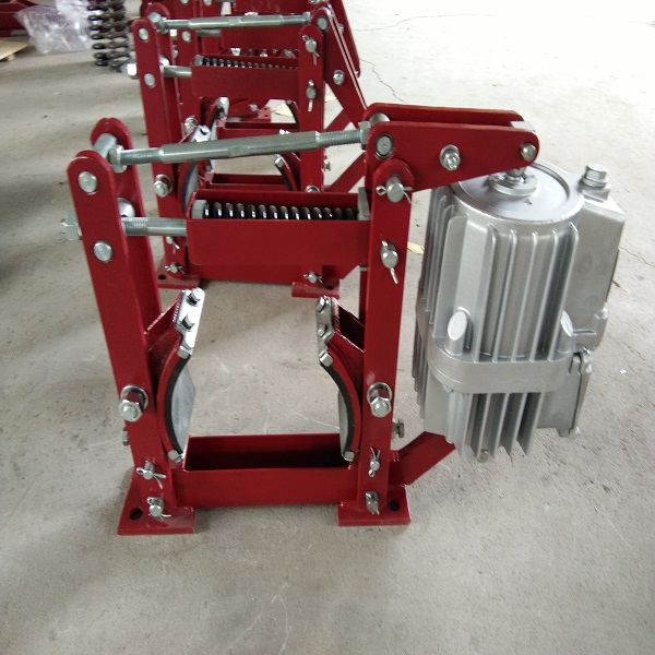 当通电时,电力液压推动器动作,其推杆迅速升起,并通过杠杆作用把制动瓦打开(松闸);当断电时,电力液压推动器的推杆在弹簧力的作用下,迅速下降,并通过杠杆作用把制动瓦合拢(抱闸)。