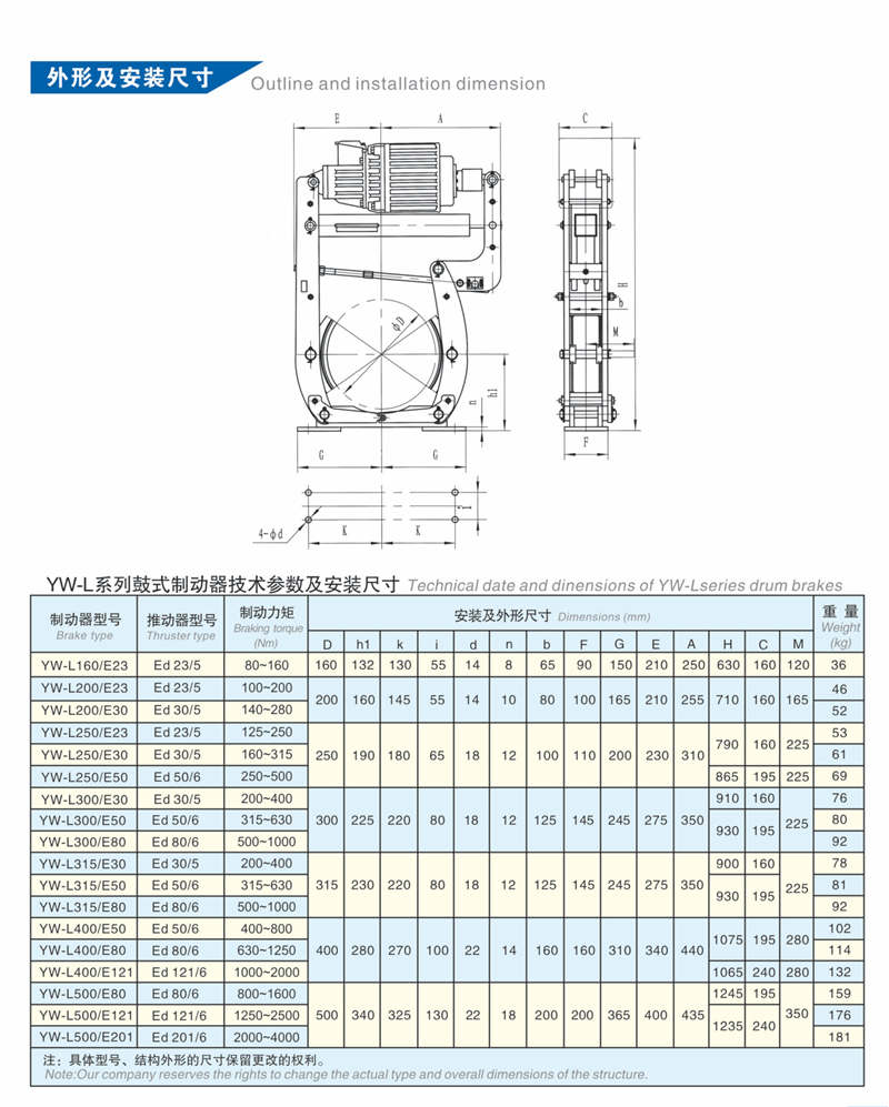 YW-L系列电力液压鼓式制动器连接尺寸和技术要求符合JB/T6406-2006标准,制动力矩参数符合DIN15435标准,配套符合DIN15430标准的ED推动器;本系列主要适用于安装空间较小,YWZ4、YWZ9、YWZ8等形式无法布置的场所。