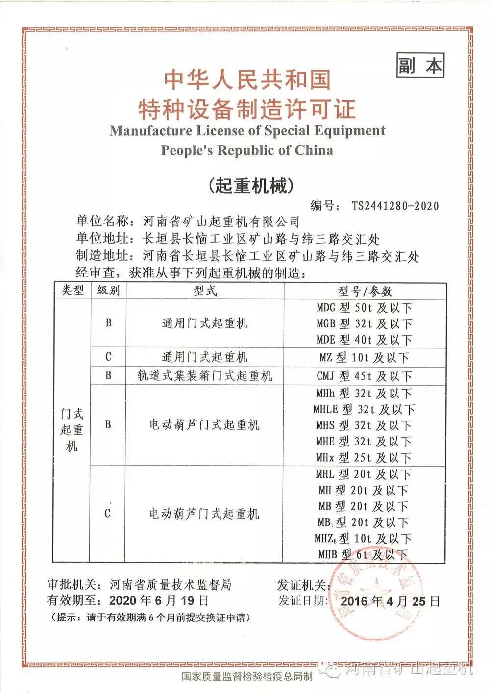 中华人民共和国特种设备制造许可证