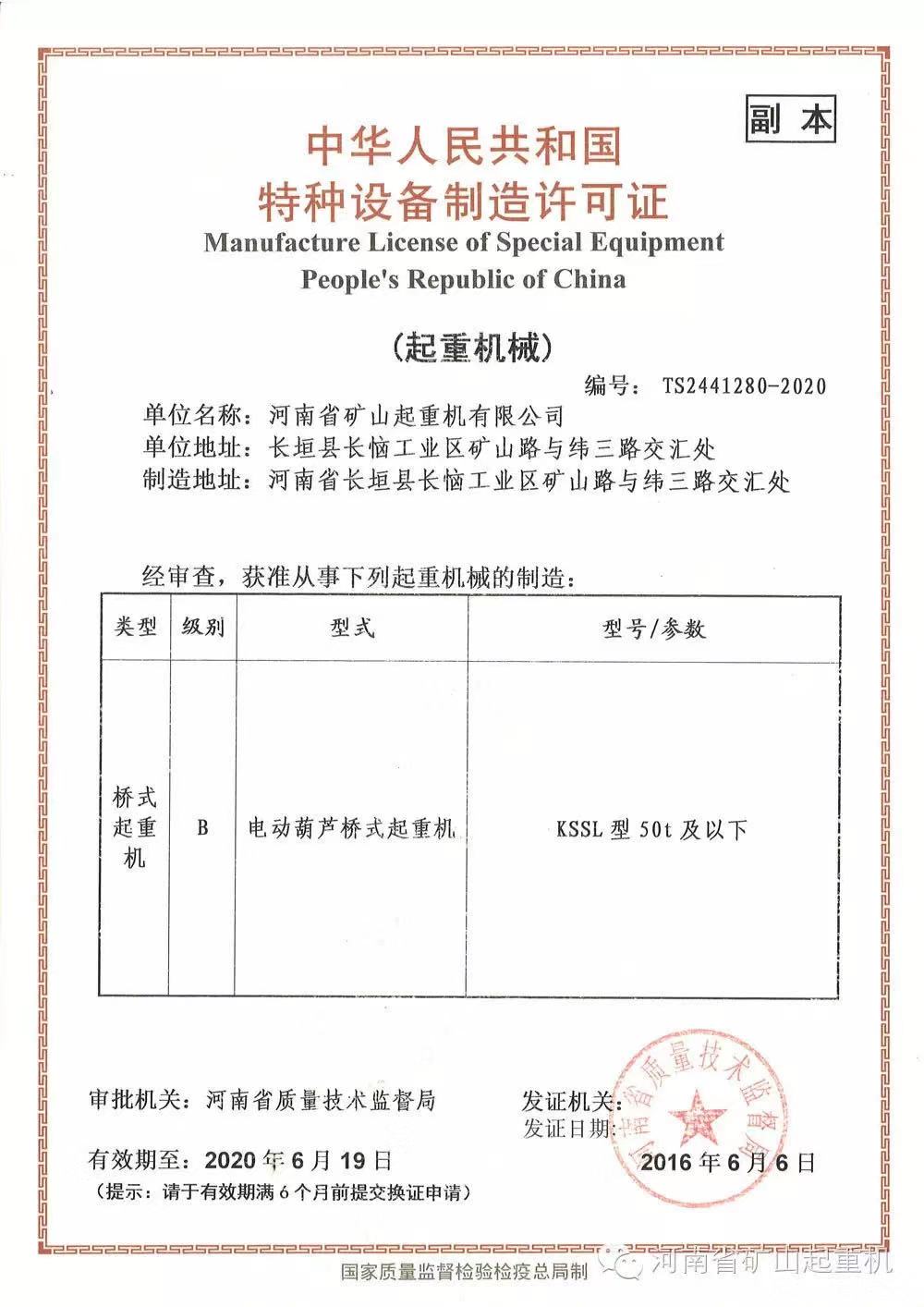 中华人民共和国特种设备制造许可证