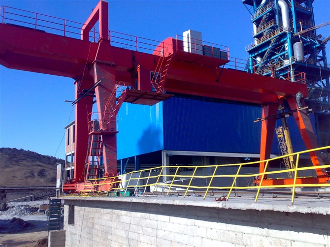 它的金属结构像门形框架,承载主梁下安装两条支脚,可以直接在地面的轨道上行走,主梁两端可以具有外伸悬臂梁。