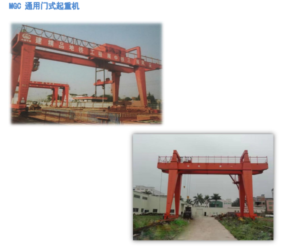 MGC型通用门式起重机是根据地下施工的使用要求及工况,在通用门式起重机的基础上研制出来的专用门吊,专用于地下施工时转倾倒渣土及吊运物品。 起重机由小车、门架、大车运行机构、液压转机构、司机室及电气设备组成。小车上设有液压翻转机构,该机构由液压工作站翻渣钩组成。所有工作机构控制均在司机操作,司机室为封闭式结构,骨架由型材焊成,结构精巧,外形美观,合理的结构设计使司机人员在座位上能清楚地观察到吊工作范围内的作业状况。内有可调式座椅,底板铺设绝缘垫,窗玻璃果用钢化玻璃,配有灭火器、空调,可根据用户要求配置讯响器、对讲机等物品。司机室内除装有操纵起重机的控制设备外,另有起重机总电源紧急断电开关、电源指示灯及超载限制器显示仪等仪表。门外设有平台,便于司机人员从地面进入司机室,平台上另有通向桥架走合的斜梯,供检修人员使用。