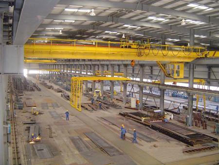 桥式起重机是横架于车间、仓库和料场上空进行物料吊运的起重设备。由于它的两端坐落在高大的水泥柱或者金属支架上,形状似桥。桥式起重机的桥架沿铺设在两侧高架上的轨道纵向运行,可以充分利用桥架下面的空间吊运物料,不受地面设备的阻碍。它是使用范围**广、数量**多的一种