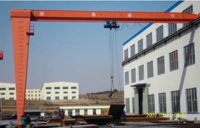 它的金属结构像门形框架,承载主梁下安装两条支脚,可以直接在地面的轨道上行走,主梁两端可以具有外伸悬臂梁。