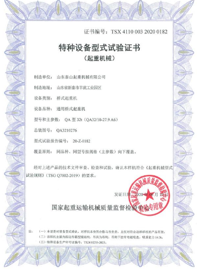 » 特种设备型式试验证书 (起重机械)桥式起重机 (通用桥式起重机)