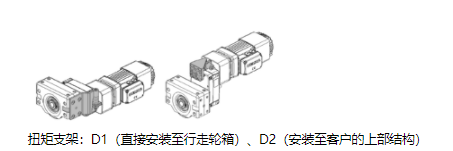德马格??榛低嘲珼1 扭矩支架(直接安装至行走轮箱)或 D2 扭矩支架(安装至客户的上部结构),以适应驱动力矩传送支持