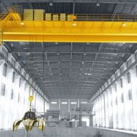 型的起重机在工业环境中。高架起重机由平行的跑道组成,行进桥横跨该间隙。一个葫芦,起重机的起重部件,沿着桥行驶。如果桥在地面上固定在固定导轨上的两个或多个支腿上受到刚性支撑,则该起重机称为