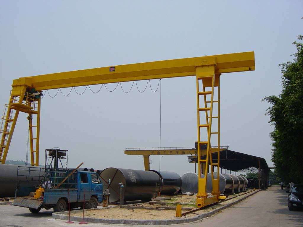 它的金属结构像门形框架,承载主梁下安装两条支脚,可以直接在地面的轨道上行走,主梁两端可以具有外伸悬臂梁。