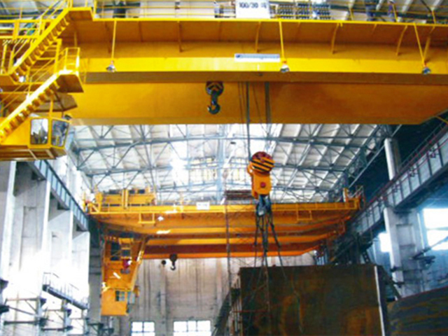桥式起重机,是一种类型的起重机在工业环境中。高架起重机由平行的跑道组成,行进桥横跨该间隙。一个葫芦,起重机的起重部件,沿着桥行驶。如果桥在地面上固定在固定导轨上的两个或多个支腿上受到刚性支撑,则该起重机称为龙门起重机或巨人起重机。
