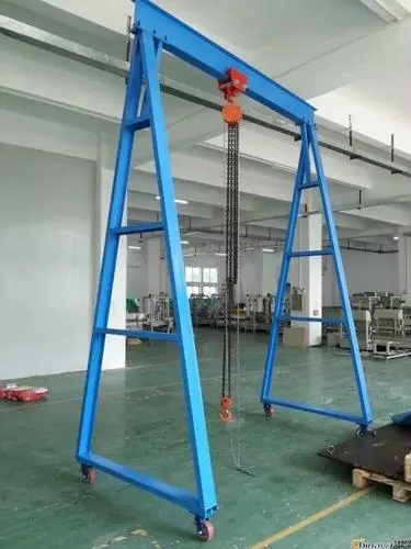 本实用新型涉及一种移动式龙门吊,包括两个行吊立梁,焊接在立梁上带有轨道的上梁,在上梁轨道上运动的电动葫芦,其特征在于:所述的行吊立梁由立梁前腿与立梁后腿组成,立梁前腿底部设置有定向轮,立梁后腿底部设置有万向轮,本实用新型技术和现有技术相比,结构简单,体积小,造价低,使用范围广.