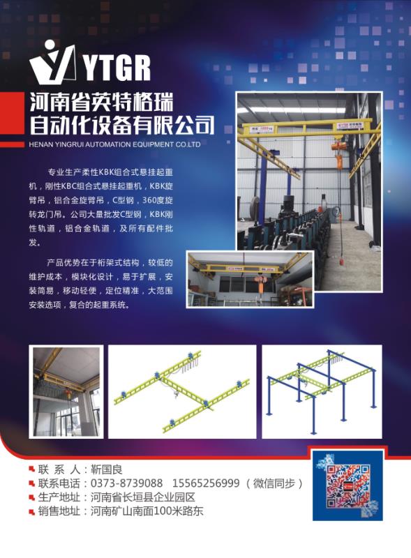:专业生产柔性KBK组合式悬挂起重机,刚性KBC组合式悬挂起重机,KBK旋臂吊,铝合金旋臂吊,C型钢,360度旋转龙门吊。我公司的优势在于桁架式结构,较低的维护成本,??榛杓疲子诶┱?,安装简易,移动轻便,
