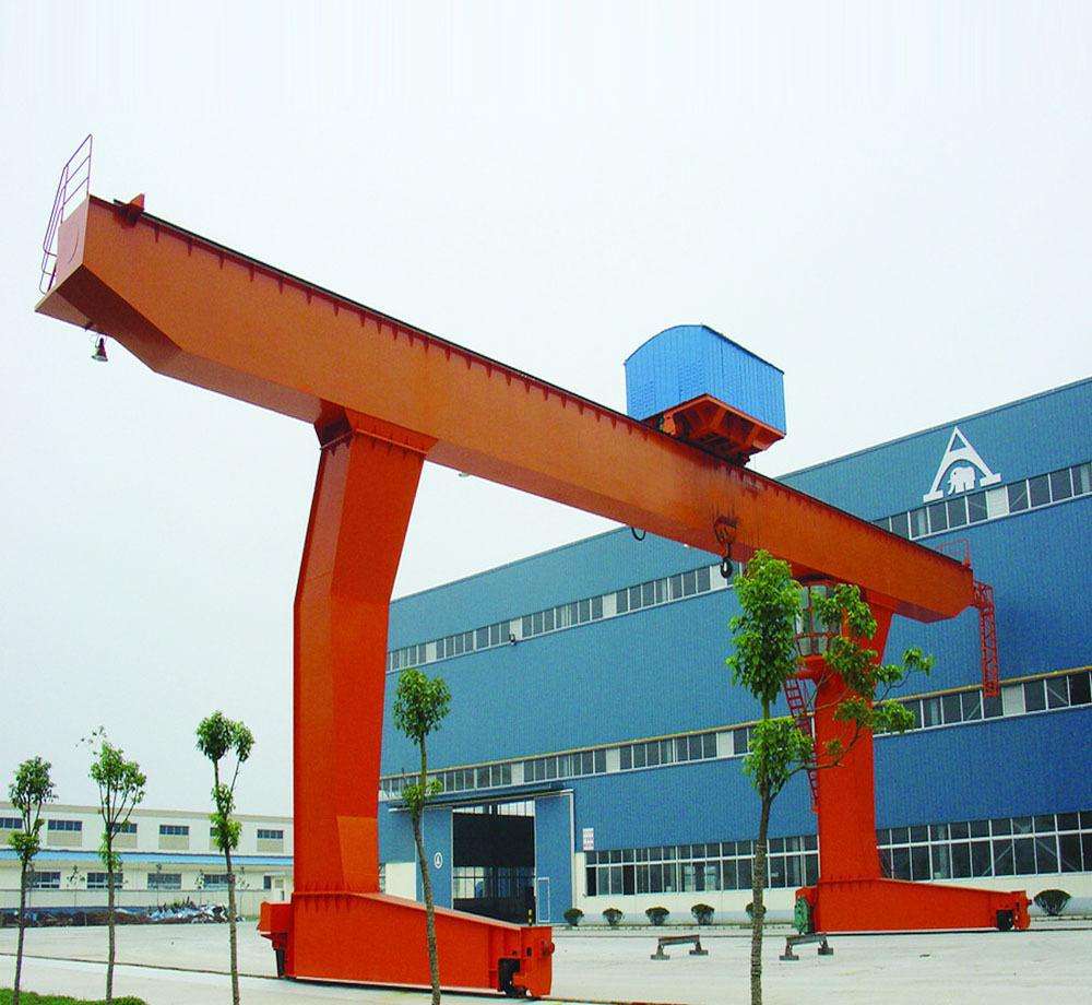 单主梁门式起重机结构简单,制造安装方便,自身质量小,主梁多为偏轨箱形架结构。与双主梁门式起重机相比,整体刚度要弱一些。因此,当起重量Q≤50t、跨度S≤35m时,可采用这种形式。单主梁门式起重机门腿有L型和C型两种形式。L型的制造安装方便,受力情况好,自身质量较小,但是,吊运货物通过支腿处的空间相对小一些。C型的支脚做成倾斜或弯曲形,目的在于有较大的横向空间,以使货物顺利通过支脚。