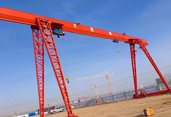 龙门吊起重机是一种桥式起重机的变形,它的金属结构像门形框架,承载主梁下安装两条支脚,可以直接在地面的轨道上行走,主梁两端可以具有外伸悬臂梁。这种起重机主要用于室外的货场、料场货、散货的装卸作业。它具有场地利用率高、作业范围大、适应面广、通用性强等特点,在港口货场得到广泛使用。