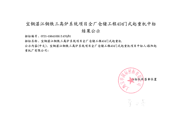 宝钢湛江钢铁三高炉系统项目全厂仓储工程45t门式起重机中标结果公示