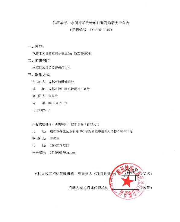 沙河羊子山水闸行吊改造项目磋商邀请更正公告