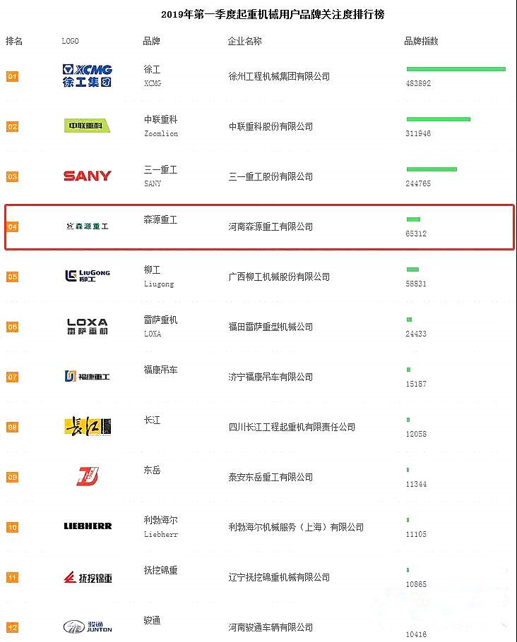 此次一季度汽车起重机用户品牌关注度排行榜中,森源重工排名仅次于徐工、中联、三一,位居第四位!