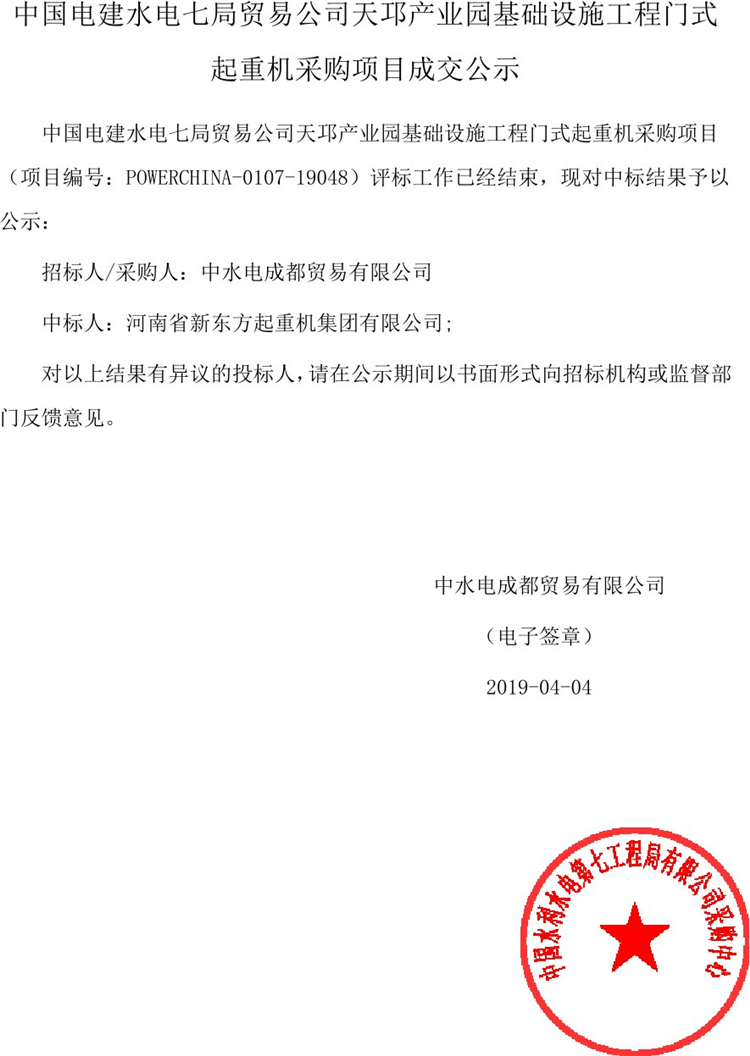 中国电建水电七局贸易公司天邛产业园基础设施工程门式起重机采购项目成交公示