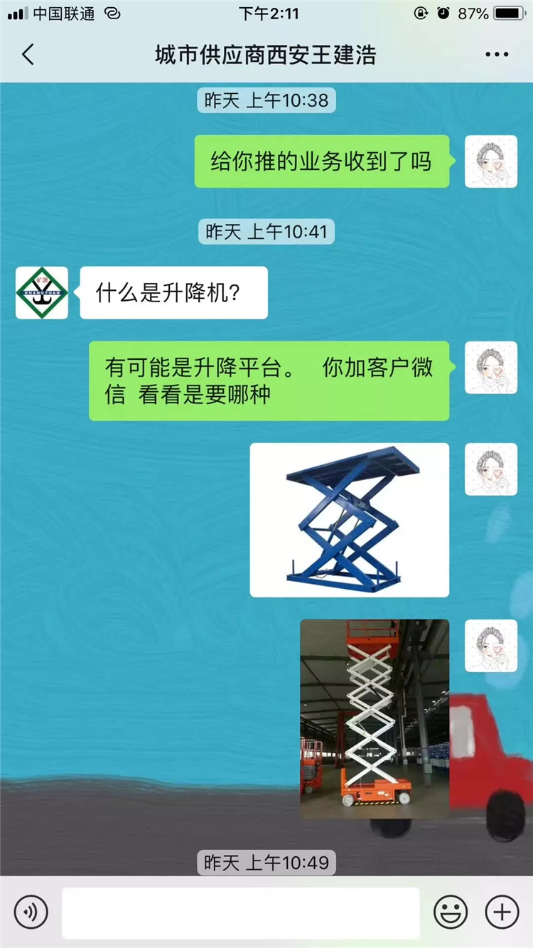 王经理本周一加入的城市供应商,昨天周五收到了第一条派送业务,当天谈成,采购单位直接打款订购了两台升降平台,今天货已到西安。好的开始,预祝以后签单多多!