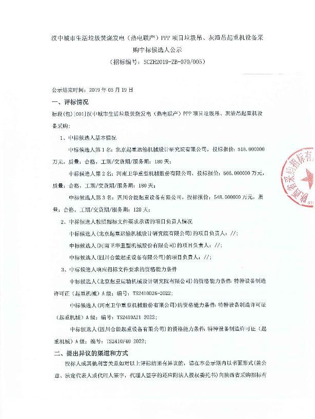 移动版:汉中城市生活垃圾焚烧发电(热电联产)PPP项目垃圾吊、灰渣吊起重机设备采购中标候选人公示