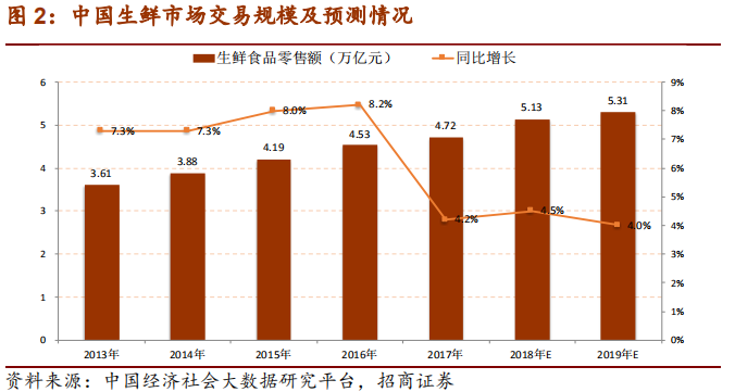 根据招商证券的一份相关报告,我国生鲜市场在2018年同比增速有所减缓,但市场整体规模仍在不断扩大,其预计在2019年将达到5.31万亿规模。