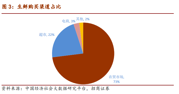 同时数据显示,传统农贸市场依然是我国居民购买生鲜的主要渠道,占比约 73%。超市渠道占比 22%,为第二大渠道。目前生鲜消费被电商渠道分流的并不多,占比约 3%。